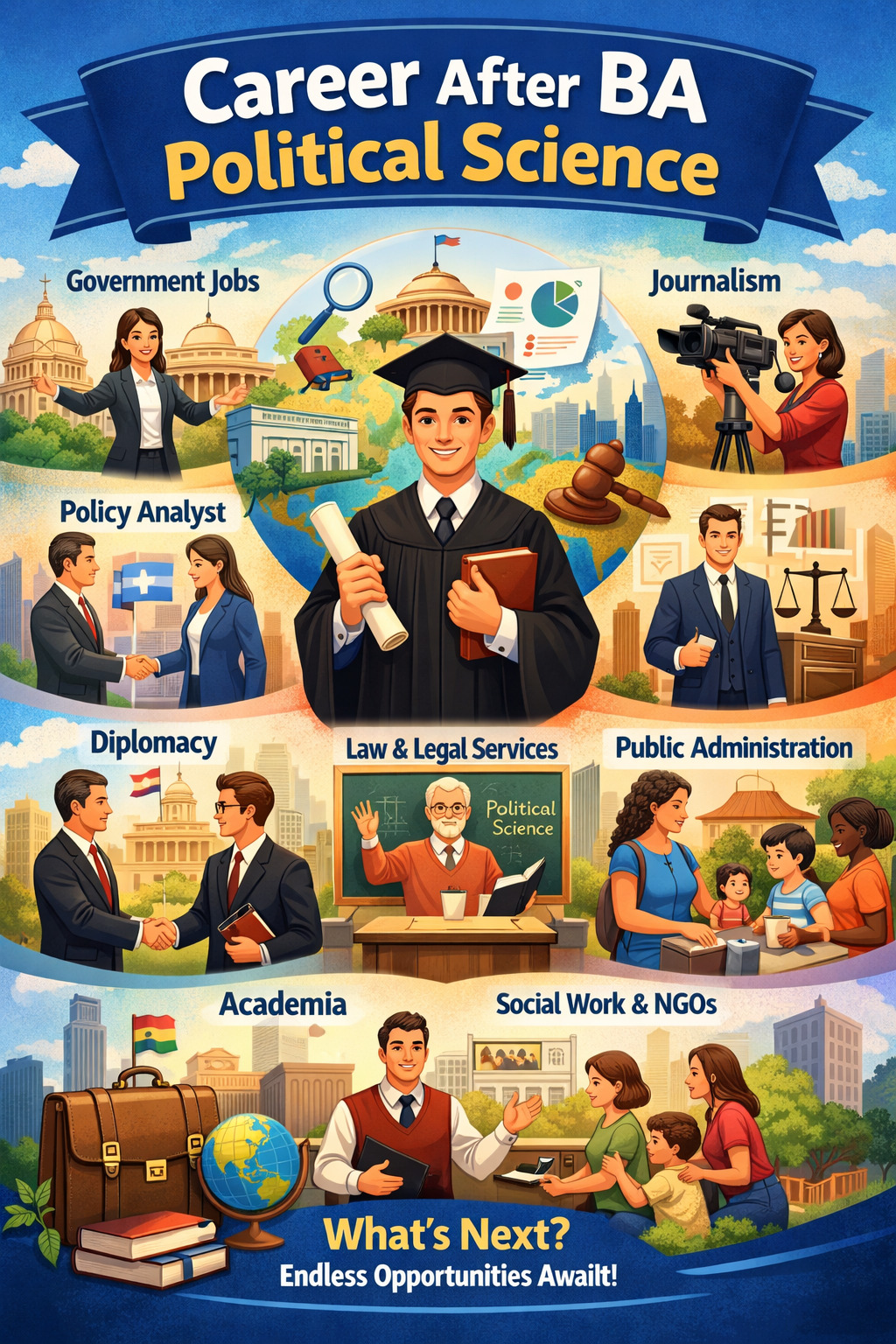 A BA in Political Science is much more than studying governments and political systems. It develops your ability to analyze situations critically, understand social structures, interpret data, and communicate ideas effectively. These skills are essential in almost every modern profession.
